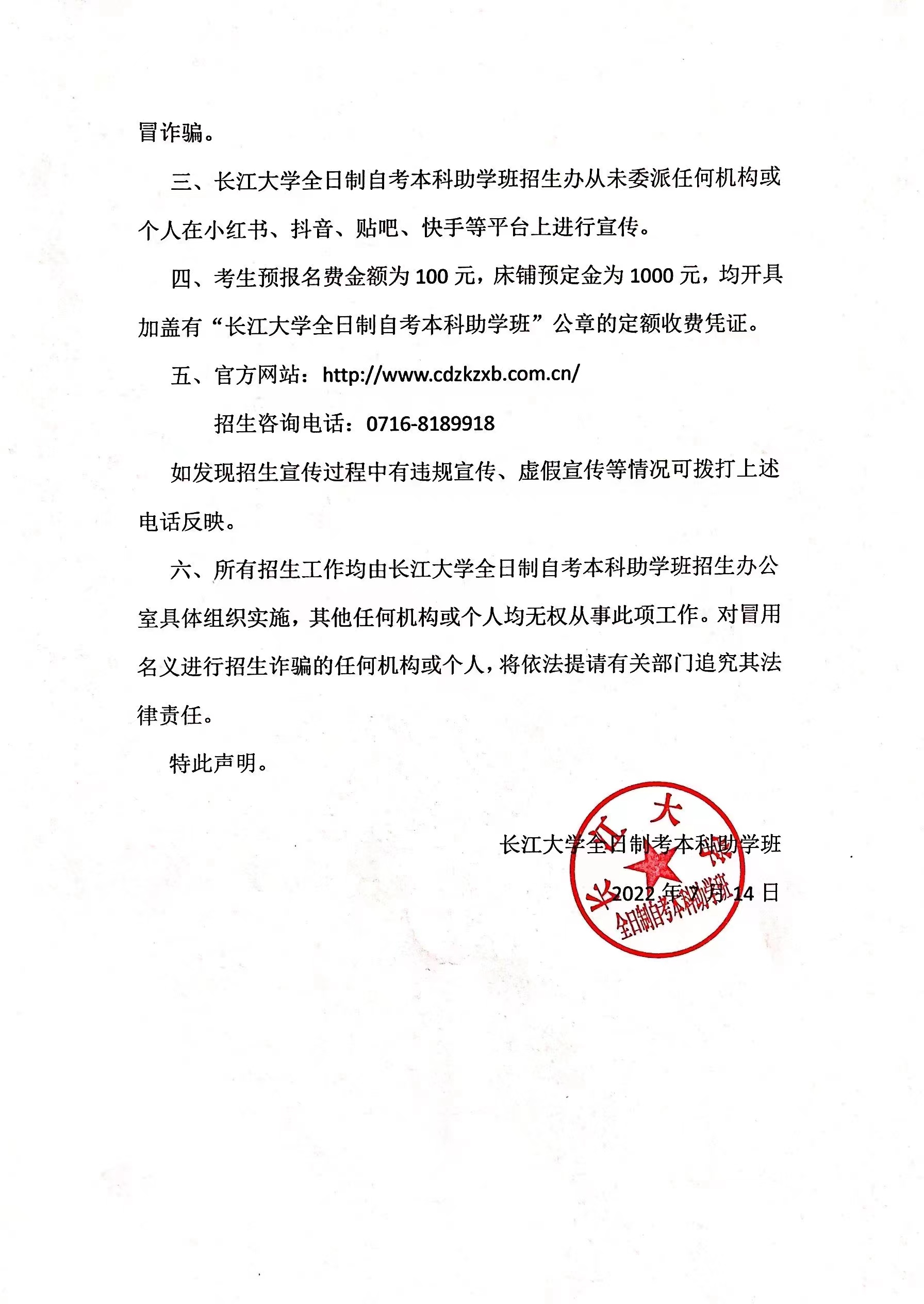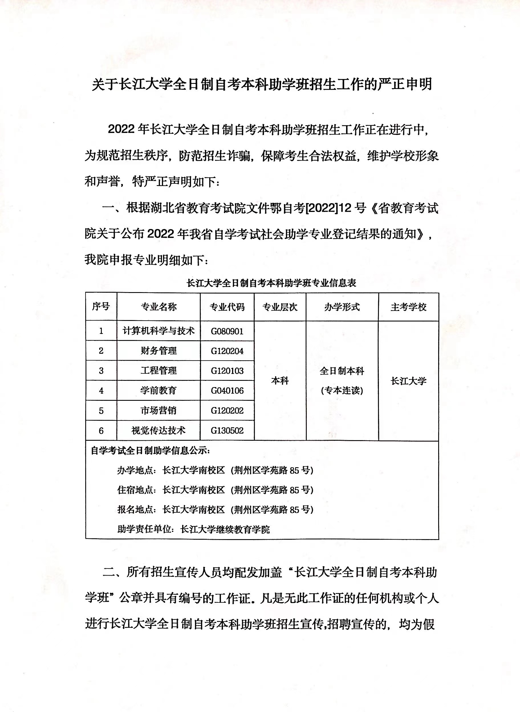 关于长江大学全日制自考本科助学班招生工作的严正声明